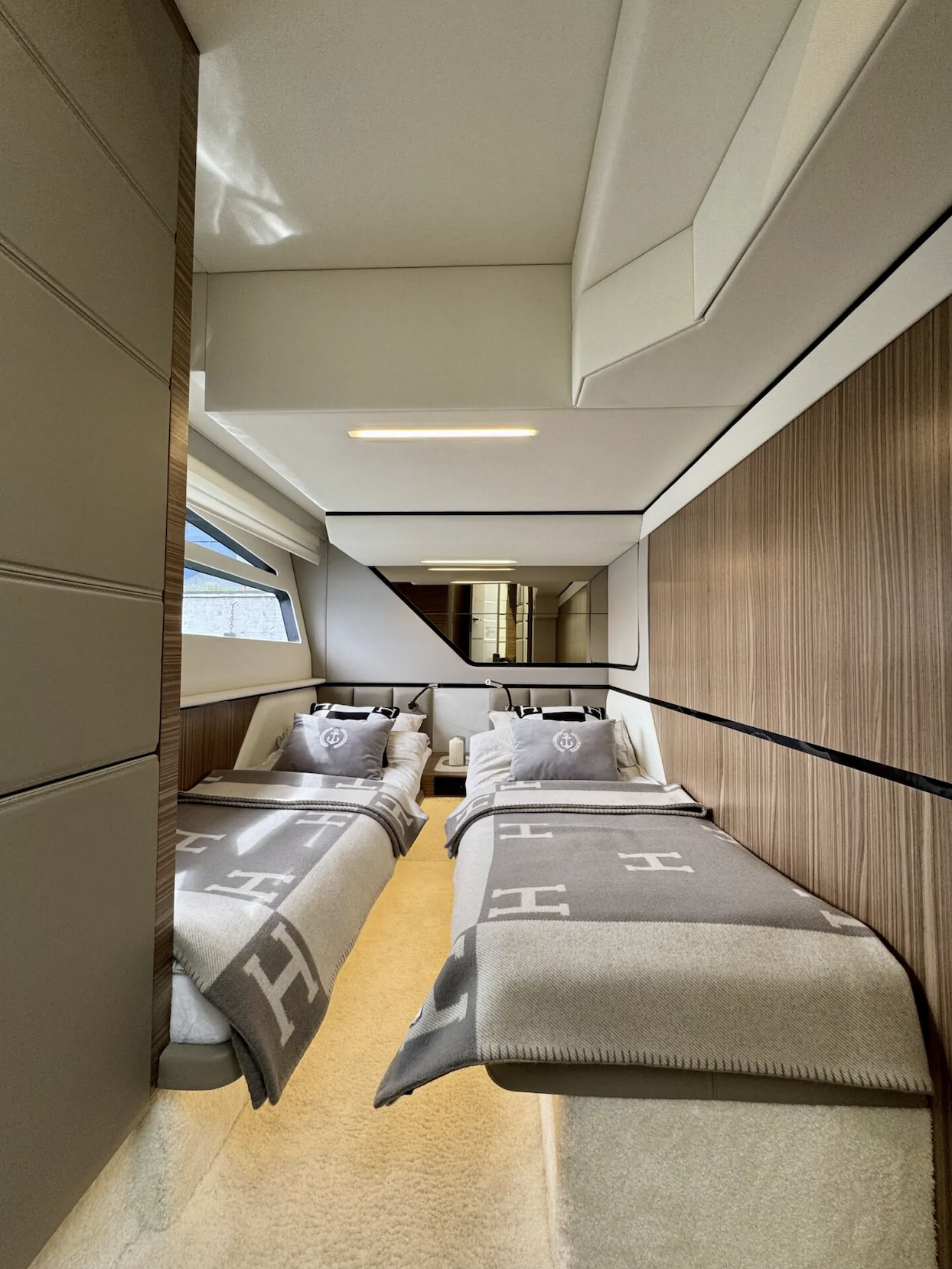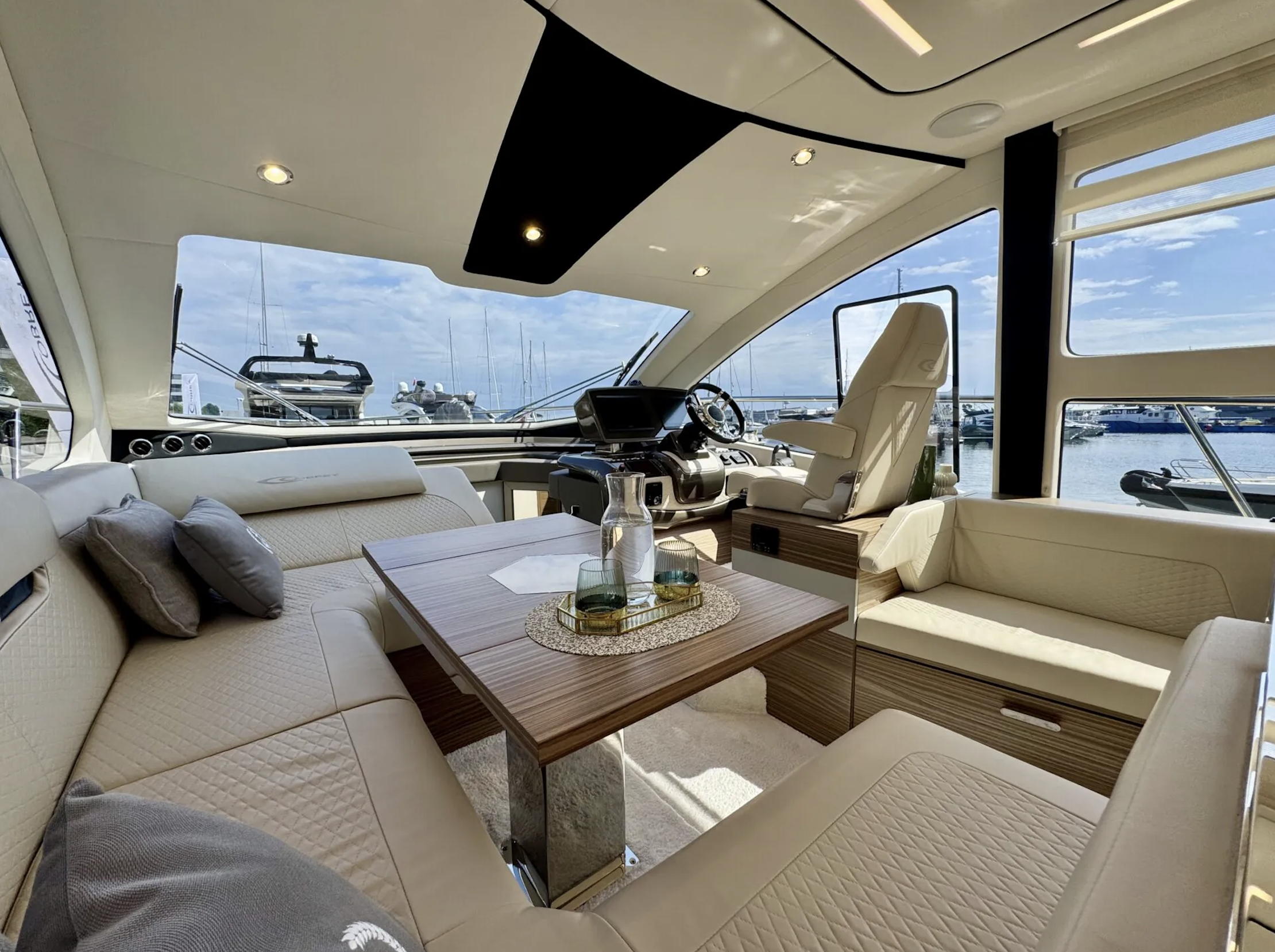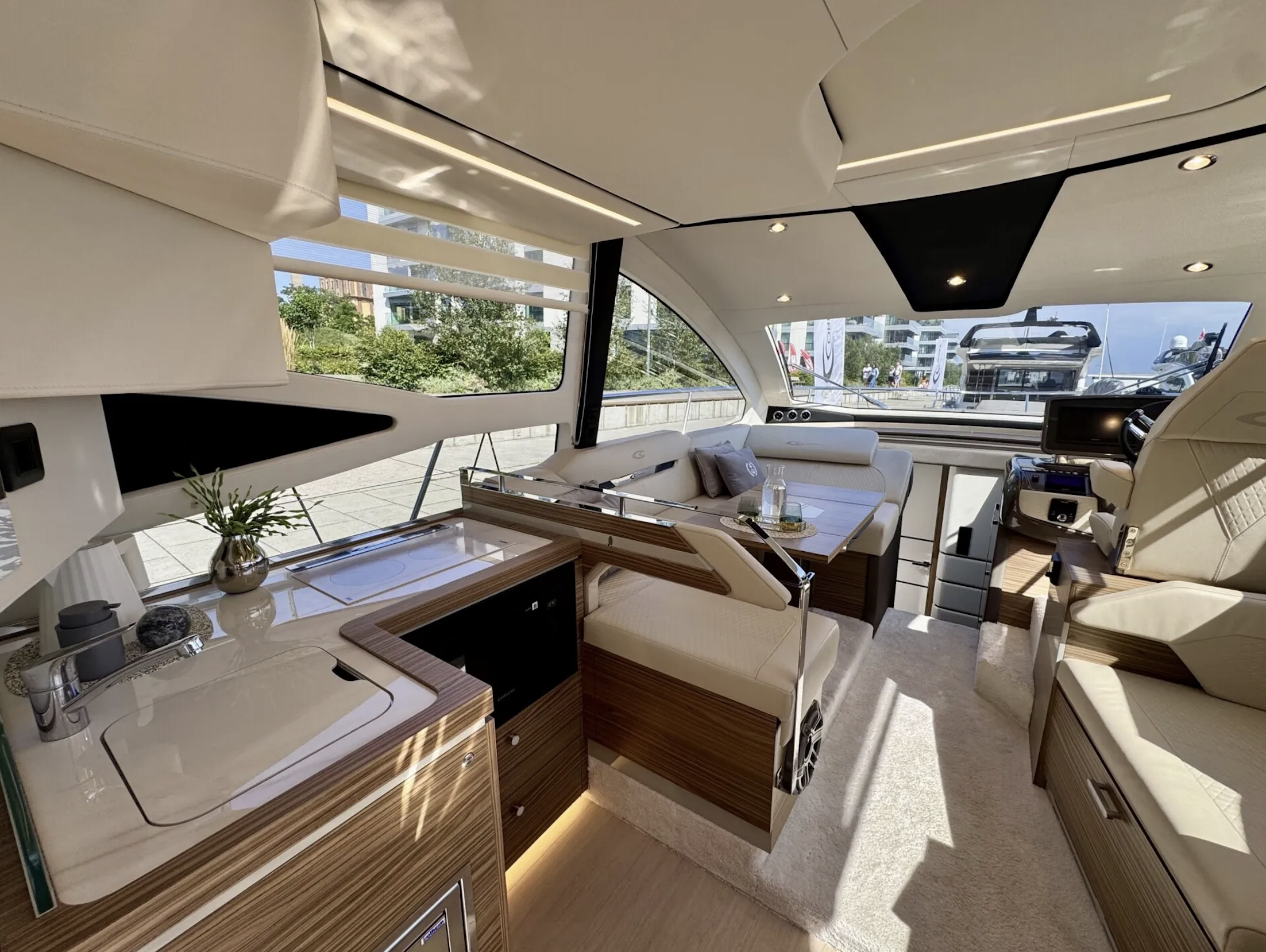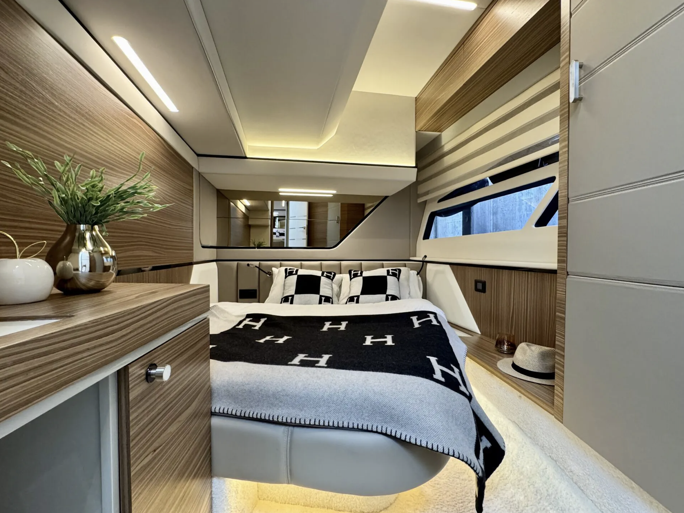 - Najbogatsza konfiguracja: Dockmate, DPS, joystick Volvo, Zipwake, pełny teak, system kamer, premium audio Bose/Fusion, generator, klimatyzacja.