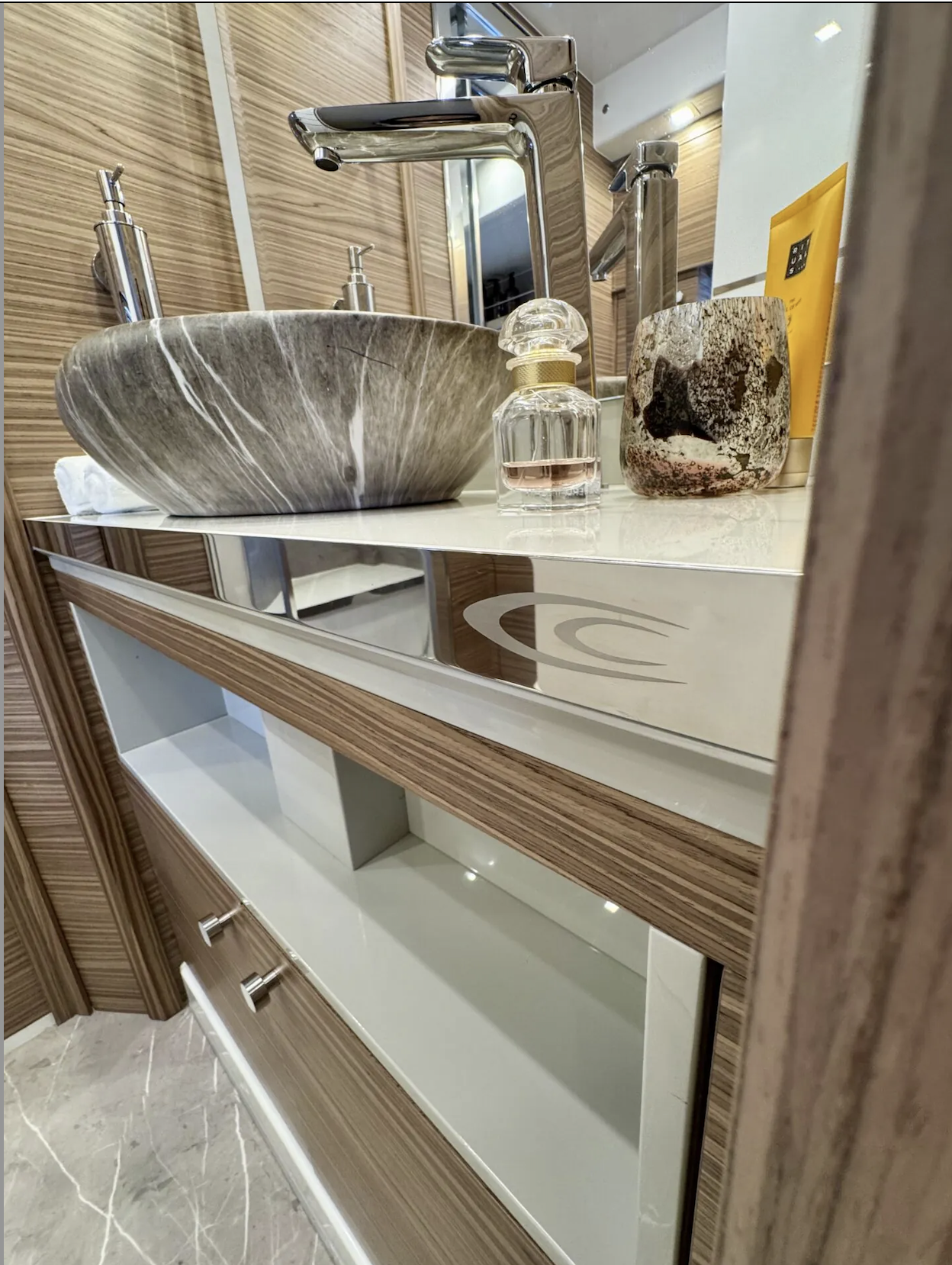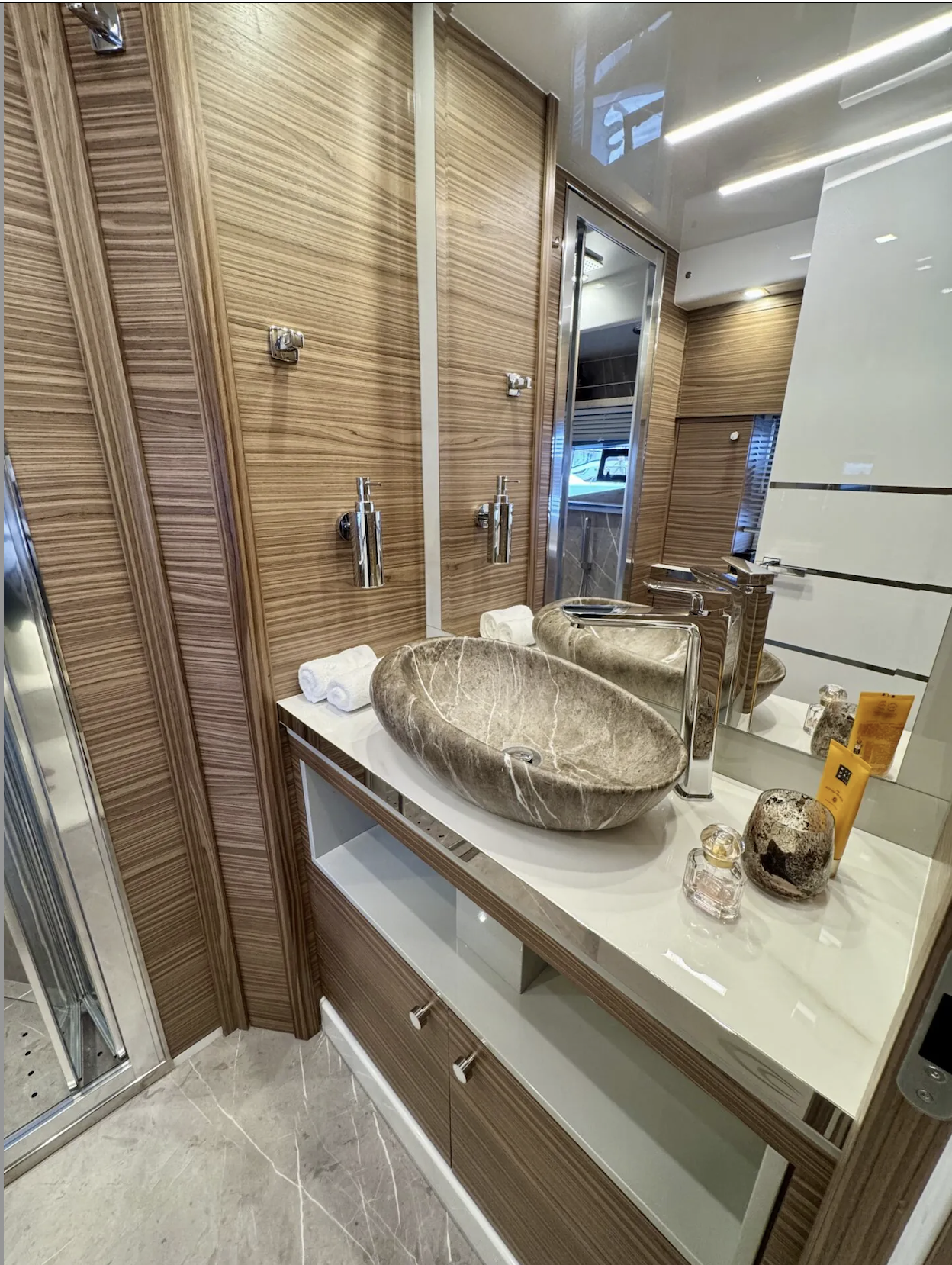 - Luksusowe wnętrze: 3 kabiny, 2 łazienki, skóra, drewno, TV w zabudowie, pełna kuchnia.